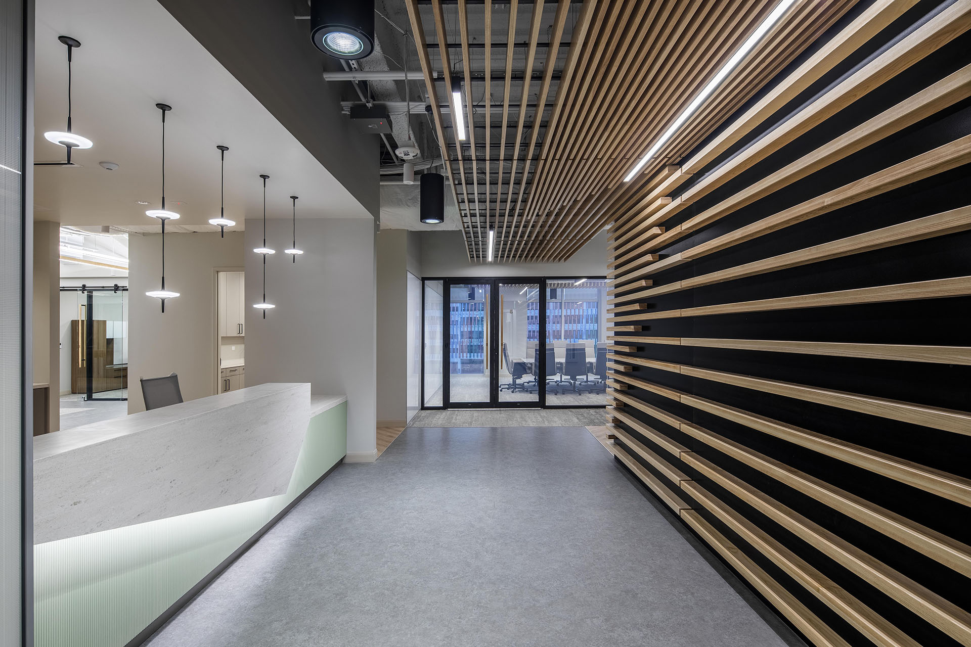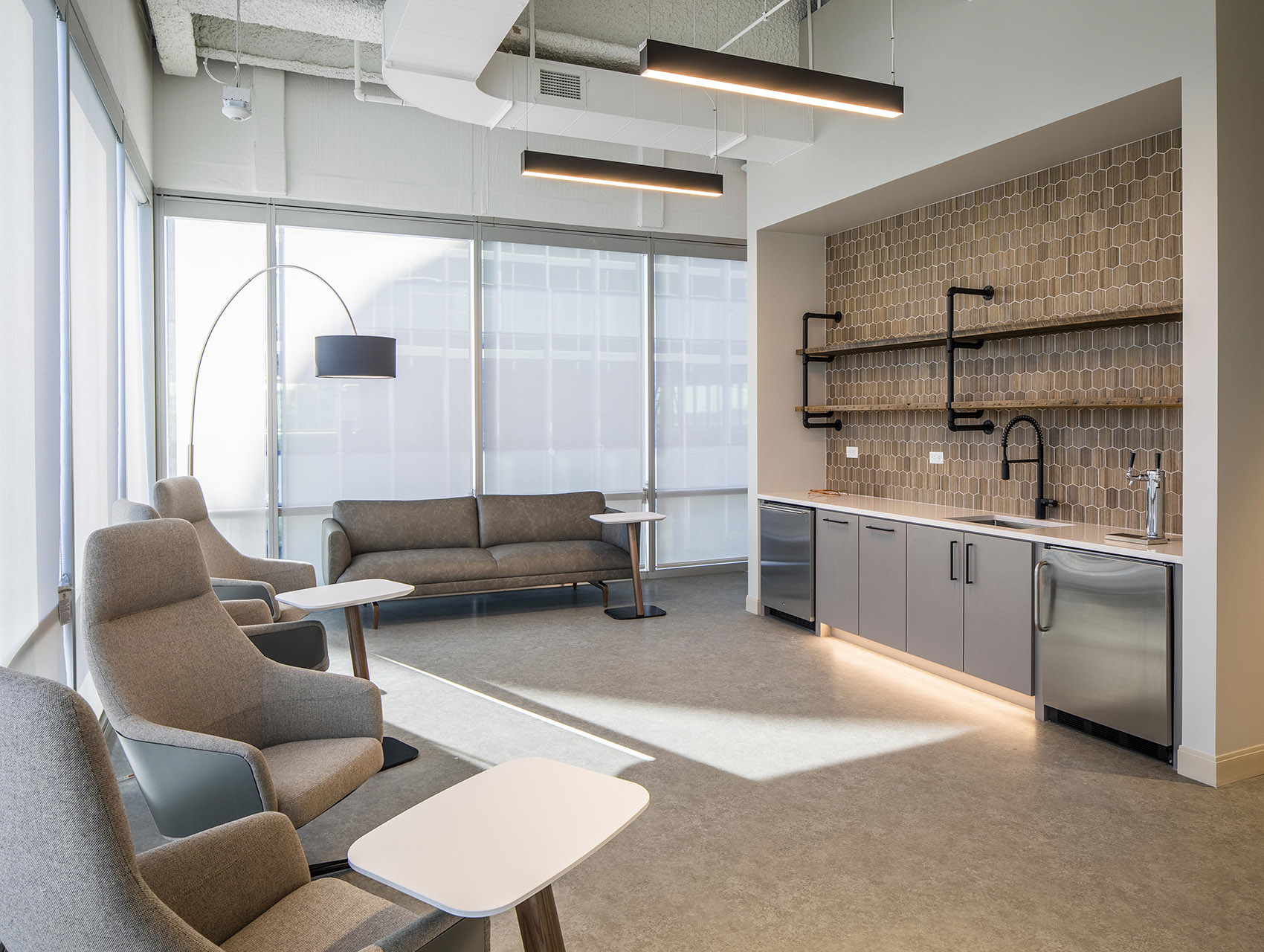 Walking into the 32,000 square foot office space, you are welcomed by a prominent wood feature that runs up the walls, and onto the ceiling overhead. This element connects and unifies the communal areas including the employee café, the executive boardroom, to the entry and reception area. The ash wood feature pays tribute to the Ames companies original branded product- the Ames shovel. Touches of ash wood are incorporated throughout the entire office and can be seen in the floor finish, millwork, lighting, and shovel handles as door hardware pulls. The secondary material palette is natural, warm, and is consistent with rectified textures and patterns. Ames is well known for outdoor and indoor home products, and their office space proudly showcases these products such as their ClosetMaid systems and millwork finishes.