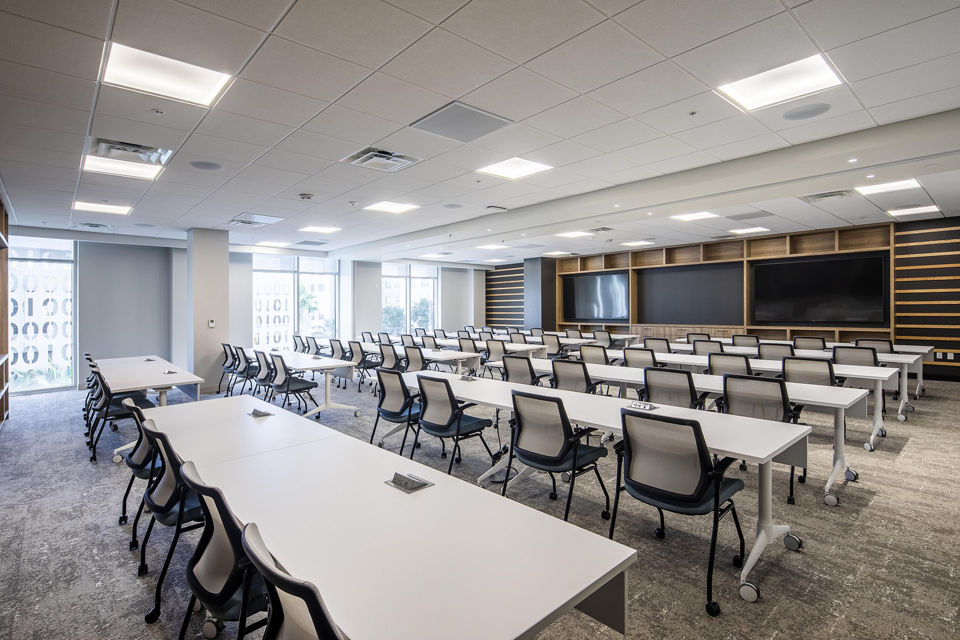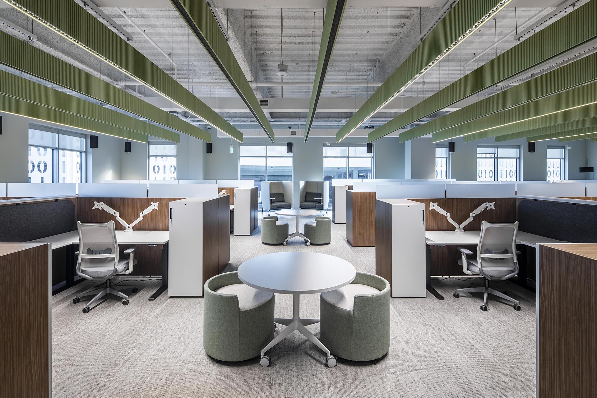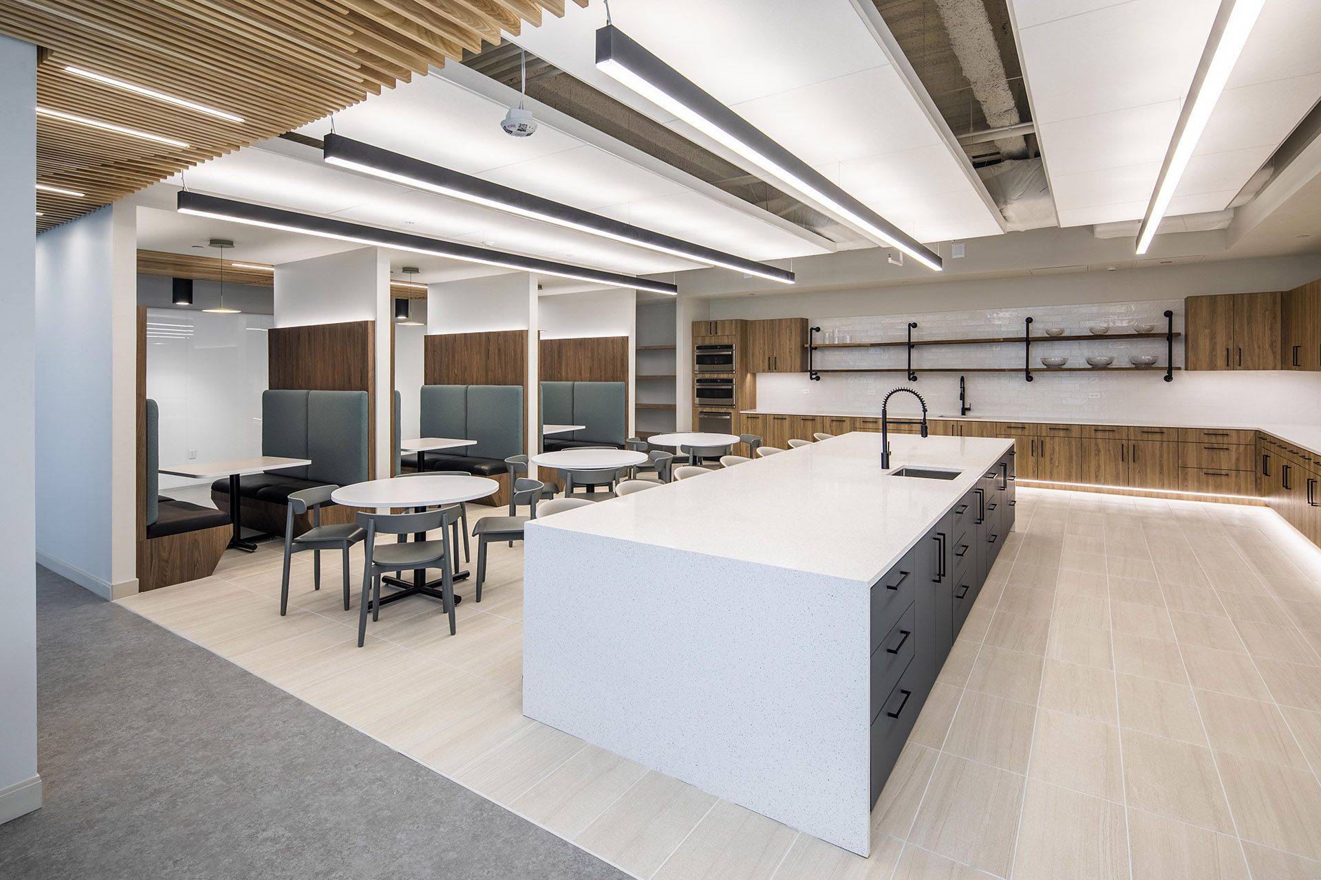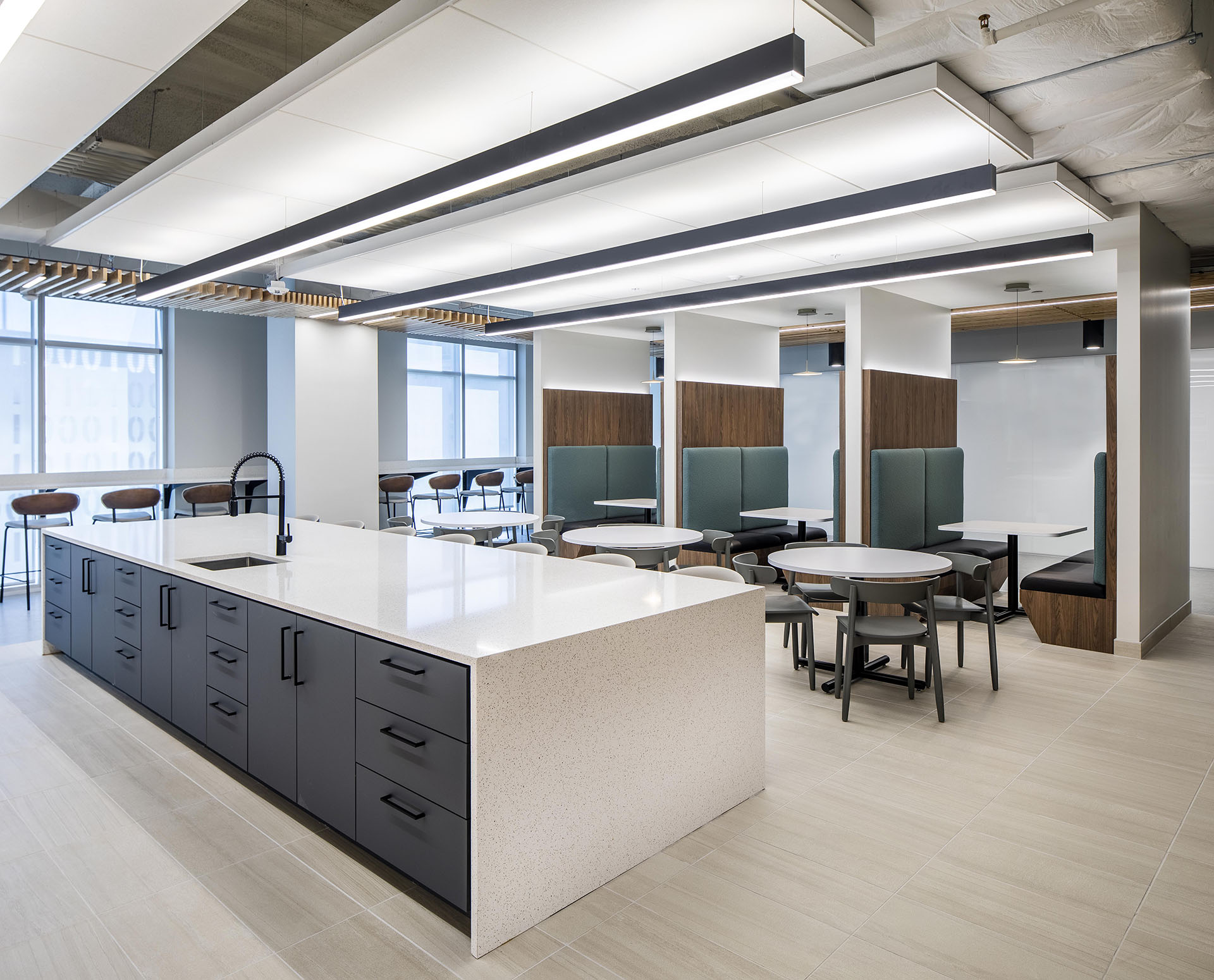 The overall layout of their office is arranged so that all communal and visitor interfacing areas are central to the floor plate flanking vertical access while the administrative and executive functions are separated into four quadrants reflecting the four committees hosted within the new Lake Nona HQ. This workplace promotes a corporate identity that employees experience upon entry and feel valued to be apart of a company that emphasizes community, comfort, collaboration, and culture.