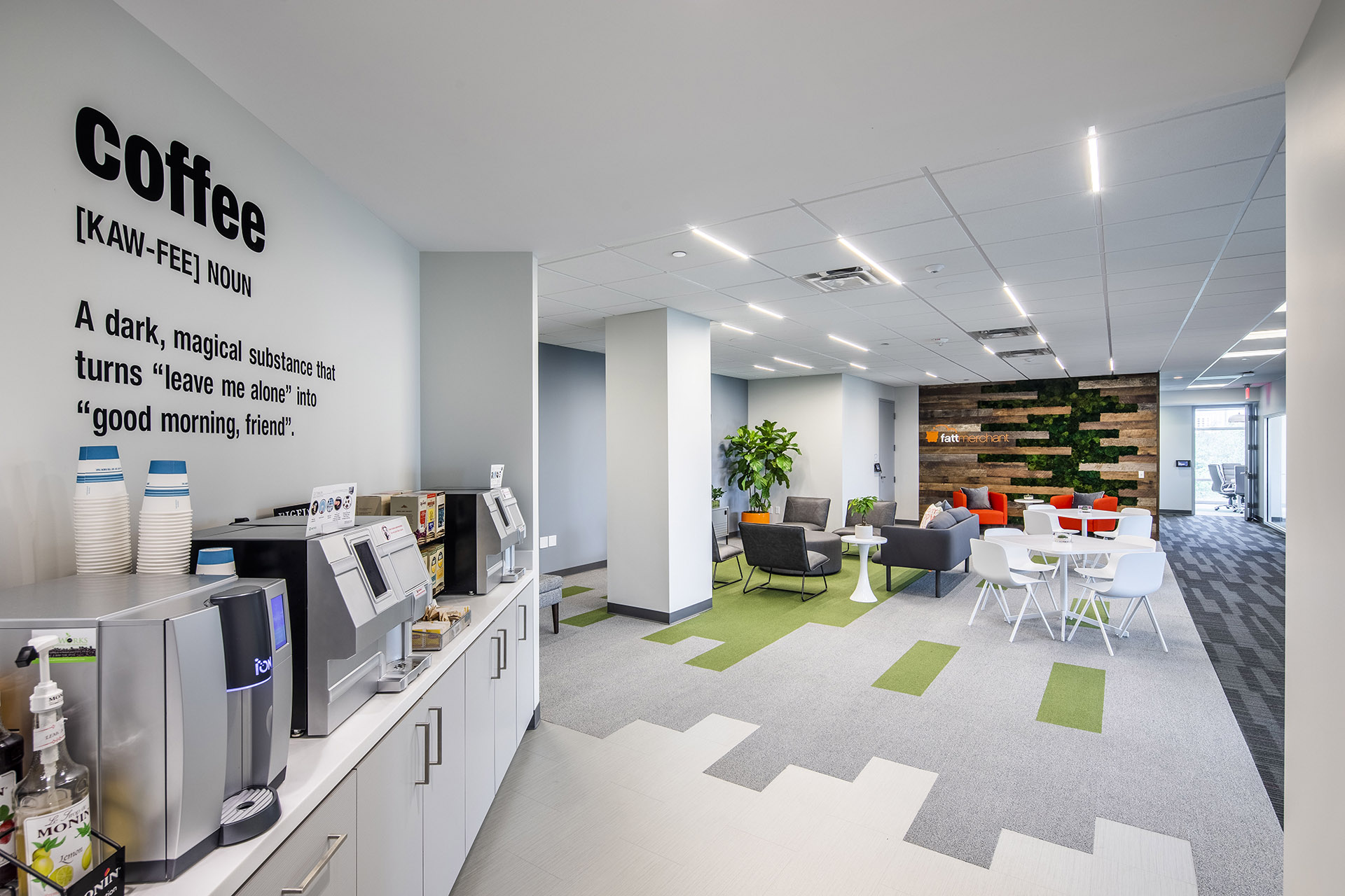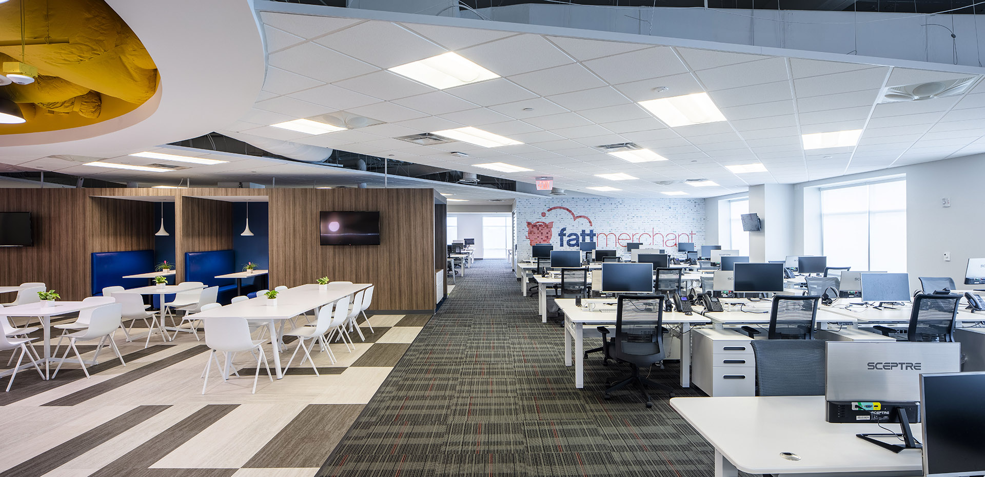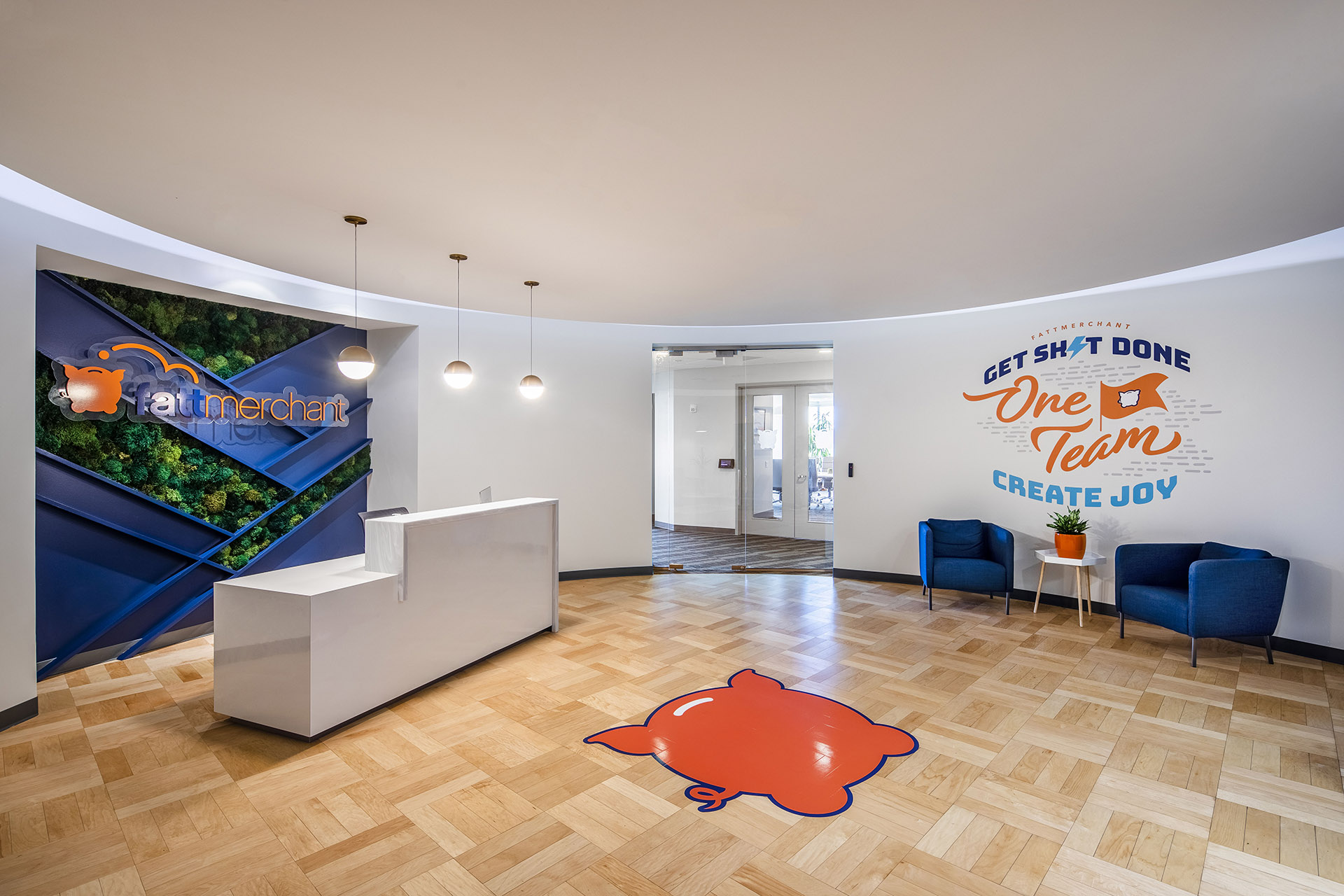Creating a fresh and energetic workplace environment for a company that prides itself on innovation and purpose gave Walker Design the motive for Fattmerchant’s new corporate headquarters in Downtown Orlando. This local start-up company set roots in Orlando six years ago and since then has expanded to be one of the nation’s financial technology leaders. Having significantly outgrown their previous space, Fattmerchant partnered with Walker Design to help redefine their brand standards, foster innovation and reinforce their culture throughout their new workplace.