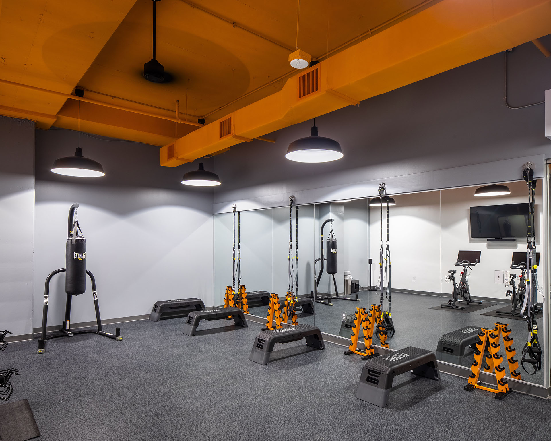 The facilities programmed within this office align with the Fattmerchant company values, ‘work hard and play hard’. The office is outfitted with an in-house training room, to educate new hires and existing employees with company updates. The teamwork does not stop there, the office also includes an on-site fitness center, gaming area, mothers lounge, podcast room, coffee bar as well as various other staff amenities. Informal meeting spaces are planned throughout the office, offering a casual space to have a quick meeting or sit with a laptop to check emails. The hub of collaboration is the employee cafe, located central to the open office. The fluid open plan allows for flexible use of this space from impromptu all-hands meetings or a 5 o’clock post-work happy hour. The eclectic use of color and materiality in this area evokes an inviting and energetic atmosphere.