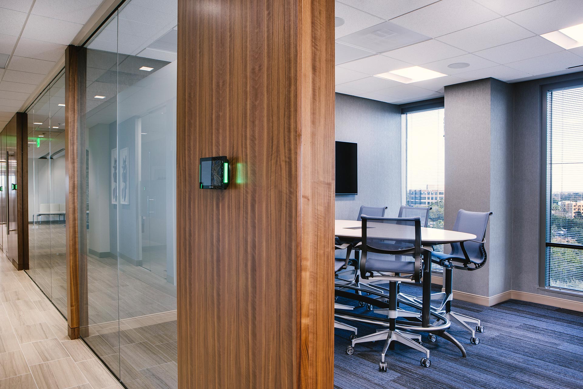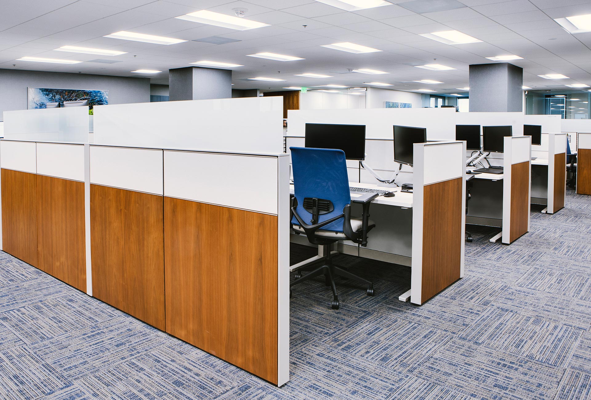 Staff wellness was a catalyst for many of the design decisions. Proximity to natural light drove the planning strategy. Each open office area is adjacent to large expanses of exterior glazing. Private offices with frameless glass perimeters line the outside corners of the building. This allows daylight to penetrate deep into the core of the office. Other staff-centered elements include a private mother’s room, vibrant artwork, and sit-to-stand desks and cafés on each level for teams to gather and share. This office design exemplifies the trend toward staff-centric workplaces.