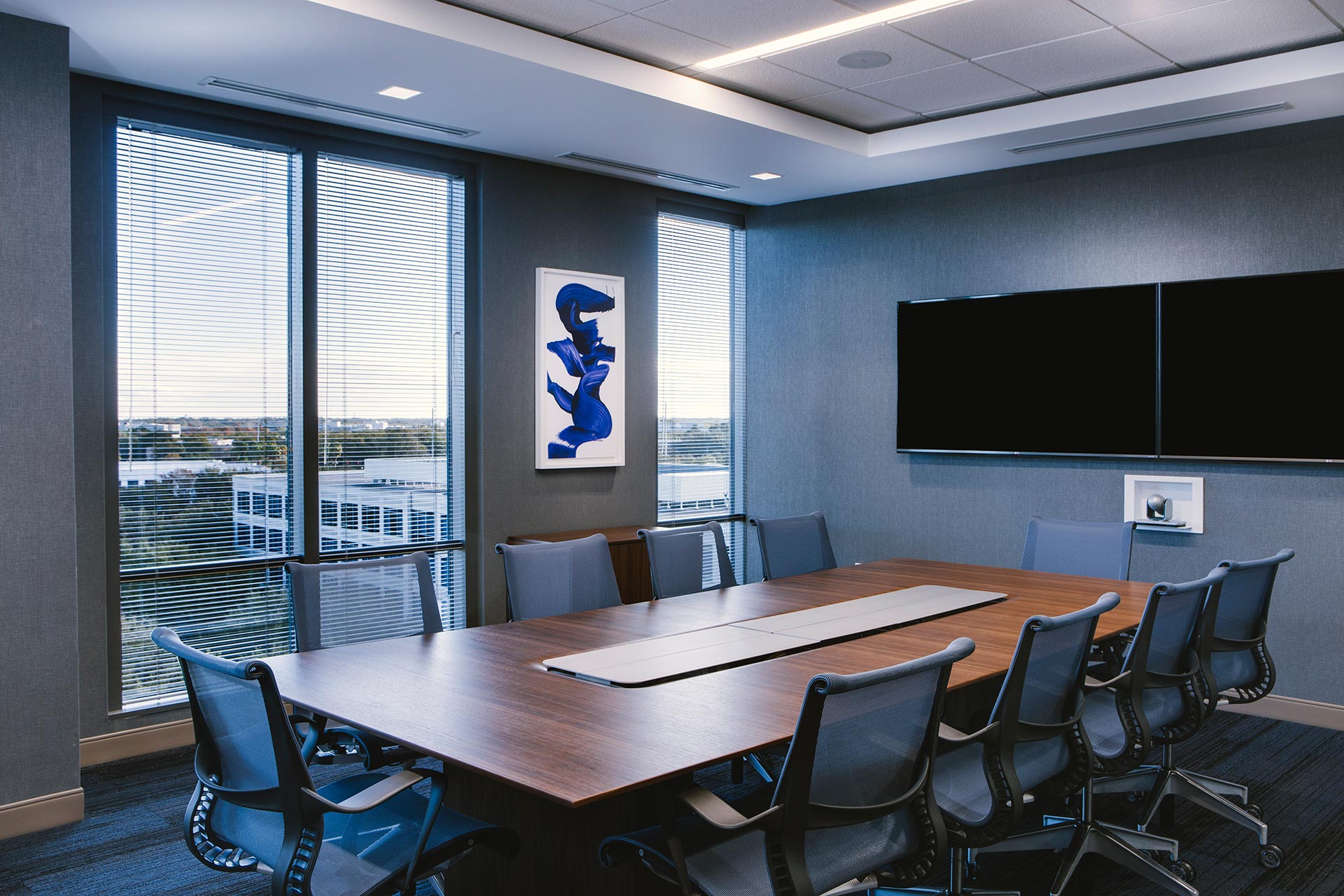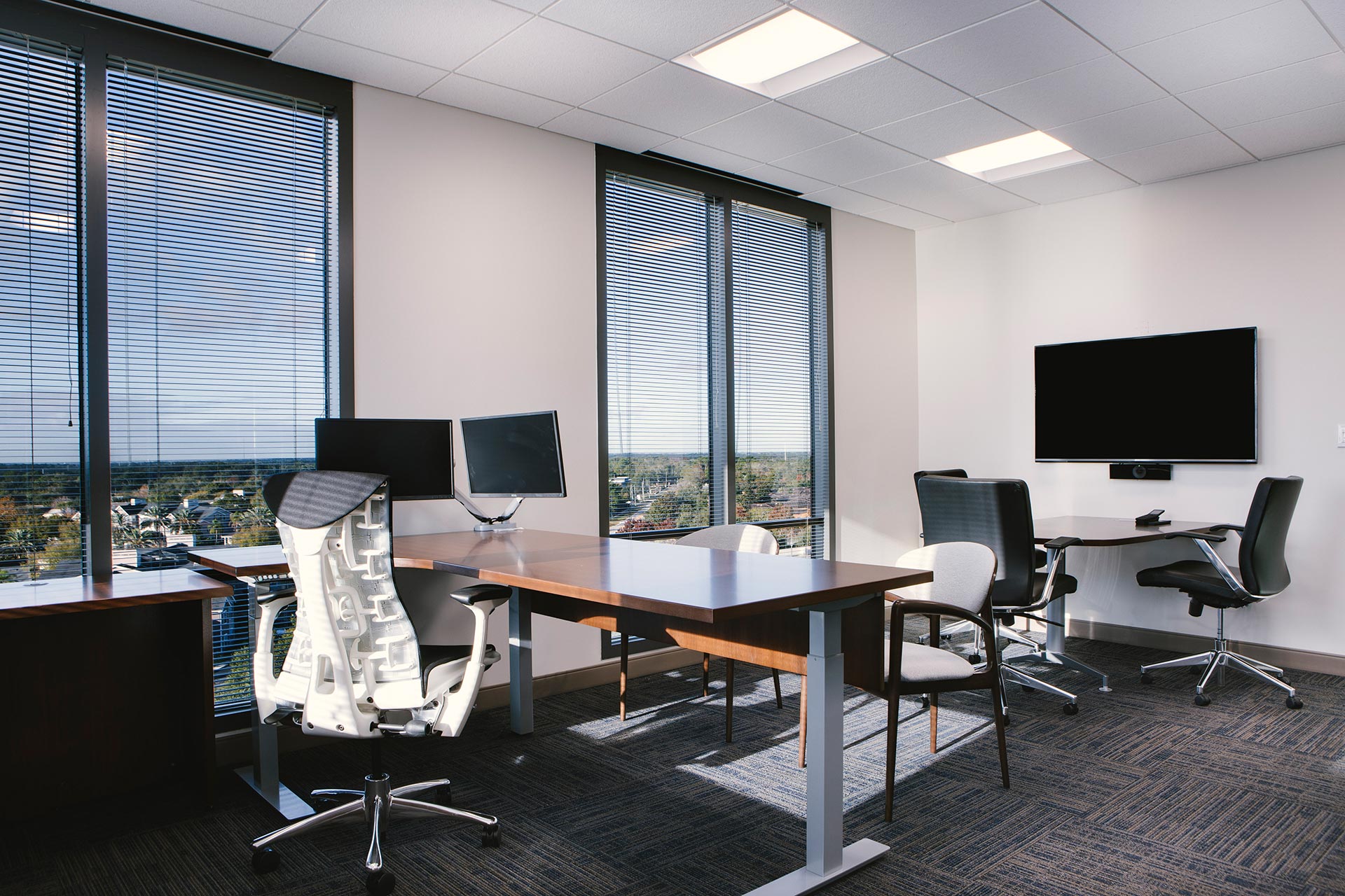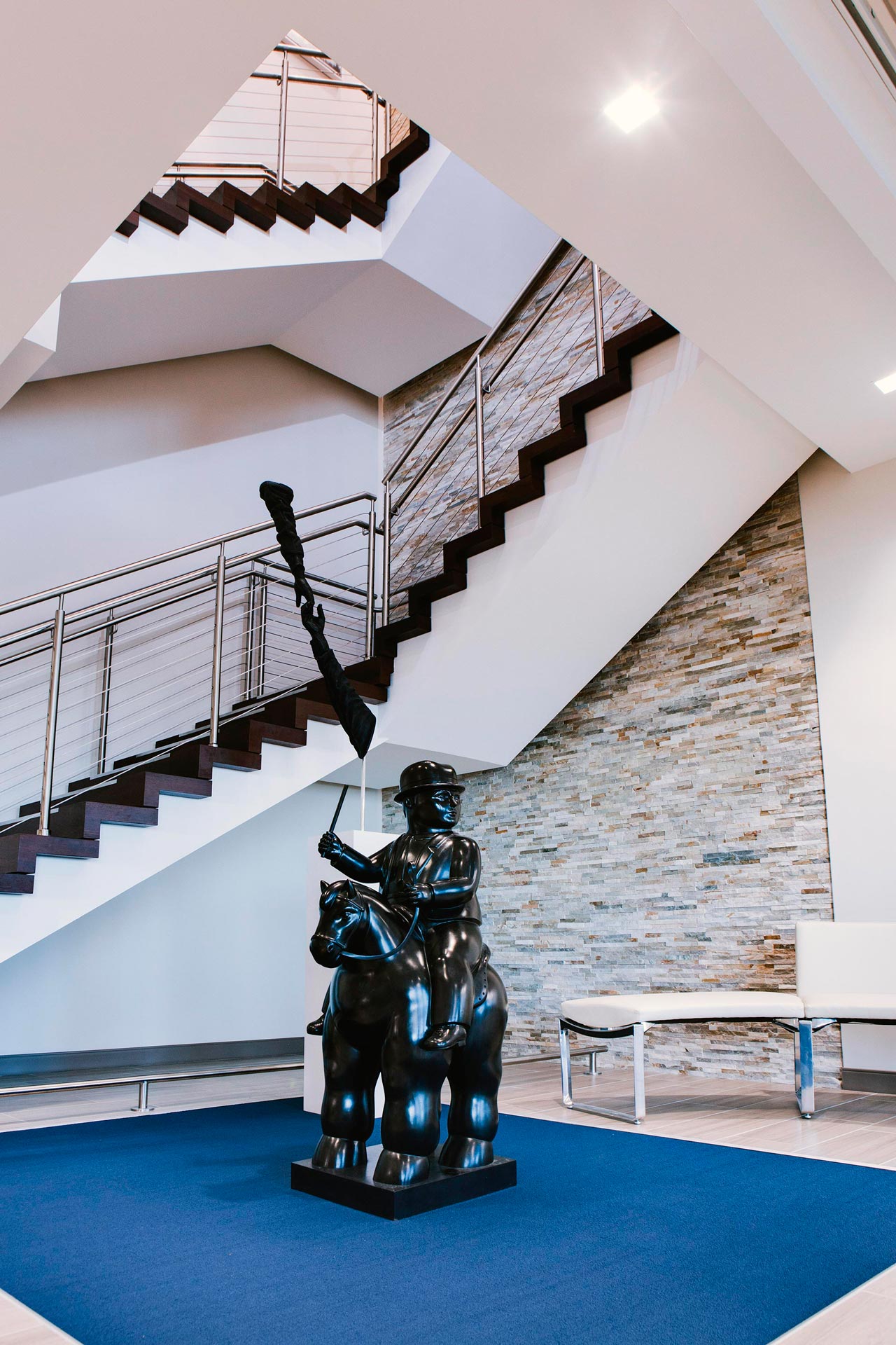 This interior architecture project was a phased corporate office expansion. The scope of work included a full floor renovation of a 15-story office tower in the City of Maitland, Florida. At project inception, the client occupied levels 8 and 9 with the intent to expand to level 7. The primary objective of the project was to bring unity to the three levels, de-emphasizing the physical stratification of the office while enriching its sense of community. A feature staircase was designed to provide both a physical and symbolic connection between floors.