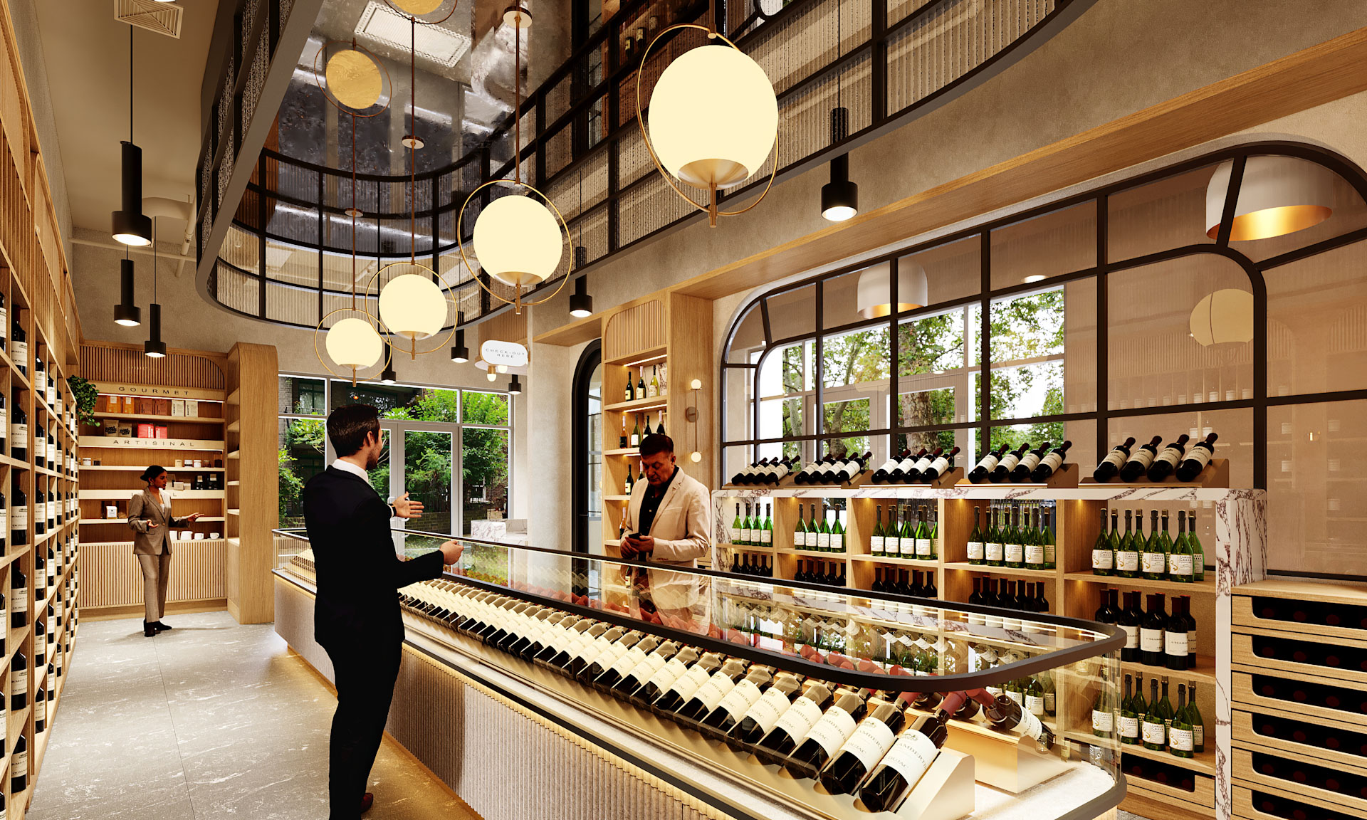 Earth tones, organic textures, and rich metals create a refined space that seamlessly blends elegance and an inviting simplicity. A central bespoke display case guides the wine shop experience and features a curated collection of wines from around the world.