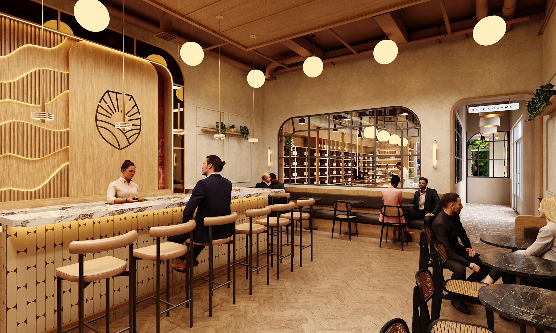 For those seeking a more exclusive experience, the lounge offers a more intimate setting for wine tasting, gourmet bites, and private events. Polished interior details, custom wood paneled ceiling, and the soft ambient glow of the lighting design, evokes a cozy and elevated atmosphere.